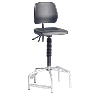 660mm dia zinc coated base with 3 x chequer plate foot treads. Black PU seat & backrest. 3 lever underseat mechanism. Individual levers for (A) gaslift seat height adjust (B) seat tilt adjust & (C) backrest angle (rake) adjustment.