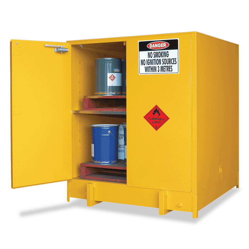 650 litre flammable liquids storage cabinet, features large open front design without centre support for ultimate access. High quality construction, manufactured in Australia.Genuine sump capacities maintained with suspended perforated floor.