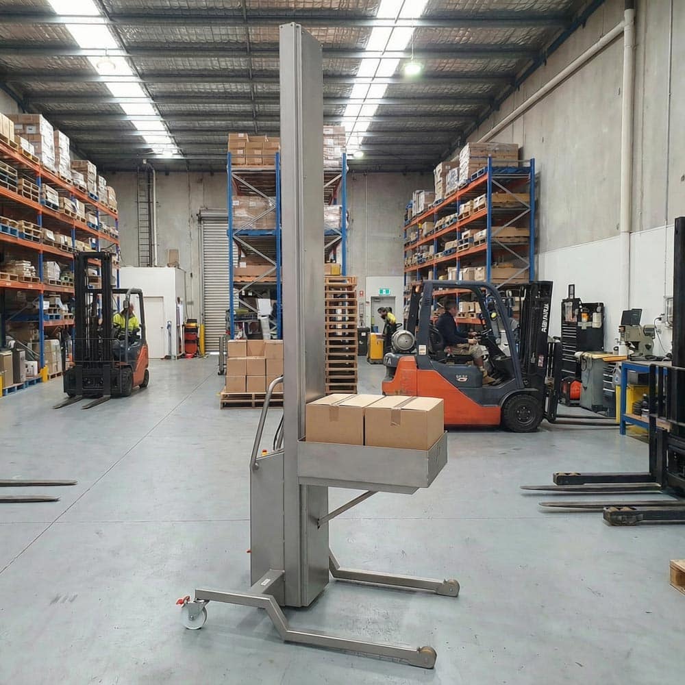 Platform and fork configurations allow the unit to be matched to carton footprint, load stability requirements and transfer method. Built for heavier loads in hygiene-sensitive facilities, this model balances structural strength with cleanability. For non-washdown industrial environments, the heavy-duty steel box lifter delivers equivalent capacity in a standard finish.