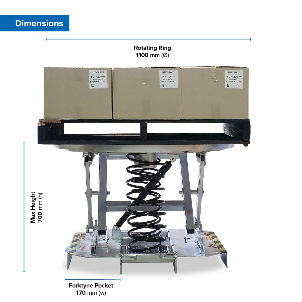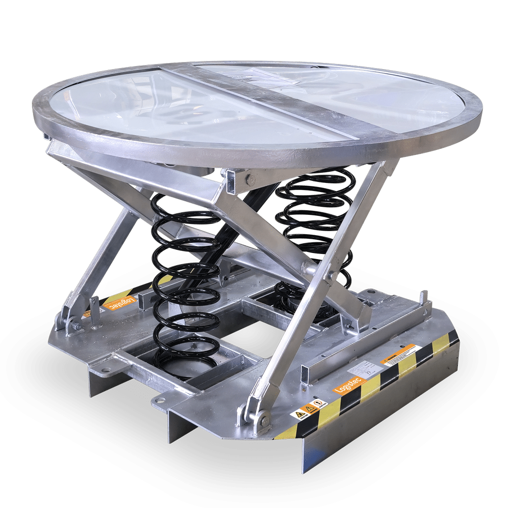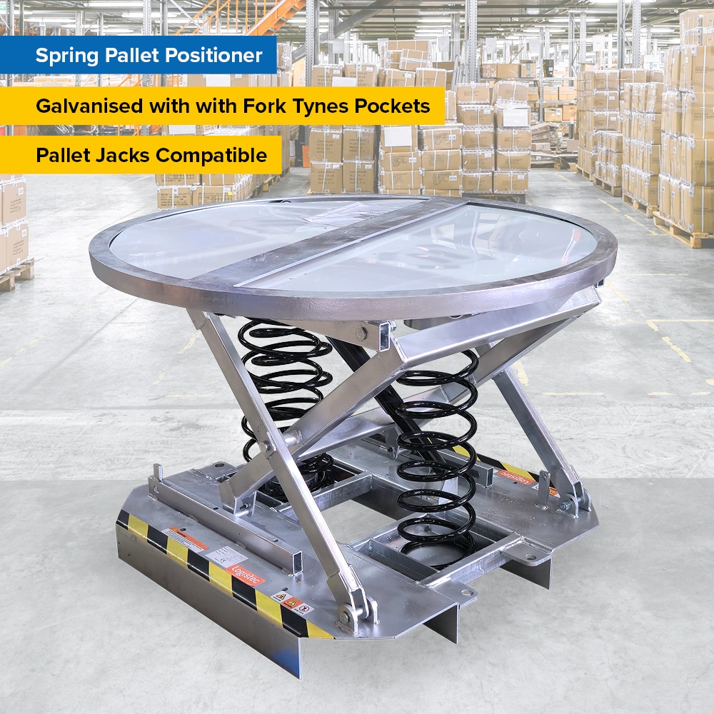 The Logistec Spring Pallet Positioner saves effort, time, and the risk of injury when loading and unloading pallets. It does this by keeping the top of a pallet load at an ergonomic height by automatically lifting or lowering as items are removed or added. The pallet load can also be rotated as the task proceeds allowing the operator to work from just one side of the pallet. It comes with three springs giving four spring combinations to suit different load weights. A mobile base is available as an option. It is suitable for most environments and with proper attention to the low maintenance requirements, this unit will provide years of trouble free service.