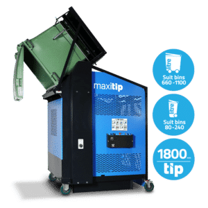The electro-hydraulic tipping mechanism allows a single operator to quickly and effortlessly empty a wide range of waste and rubbish bins. The Maxitip is simple to use, the waste bin is wheeled onto the tipping cradle and the safety door closed to allow operation. Push-button control allows the operator to raise, tip and lower bin back to ground level.