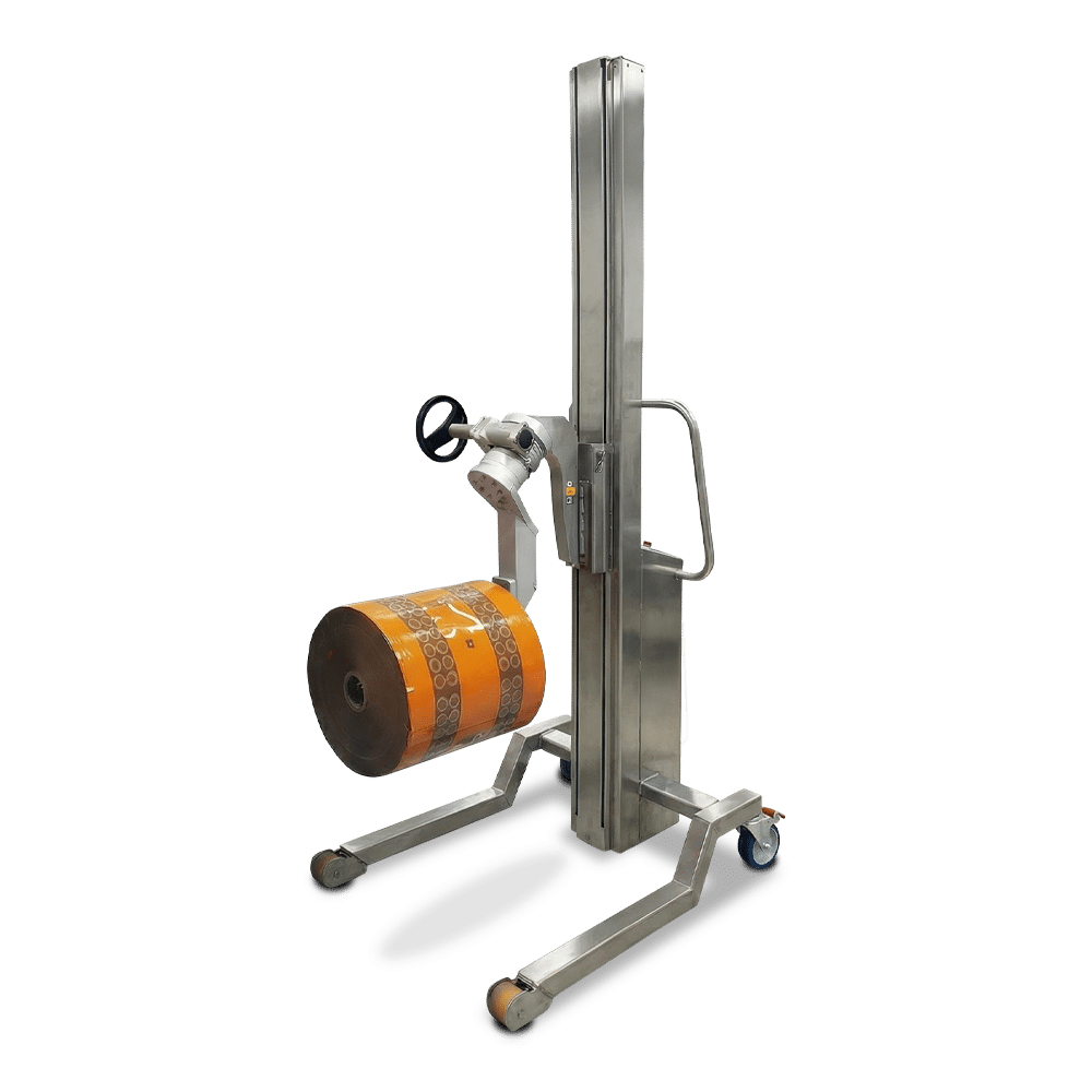 Attachment options allow the unit to adapt to different roll core sizes, diameters and handling styles — from simple shaft-based pickup to powered gripping for higher repetition workflows. This model is built for heavier rolls in hygiene-critical production zones. For industrial areas without washdown requirements, the heavy-duty steel roll lifter offers equivalent capacity in a standard finish.