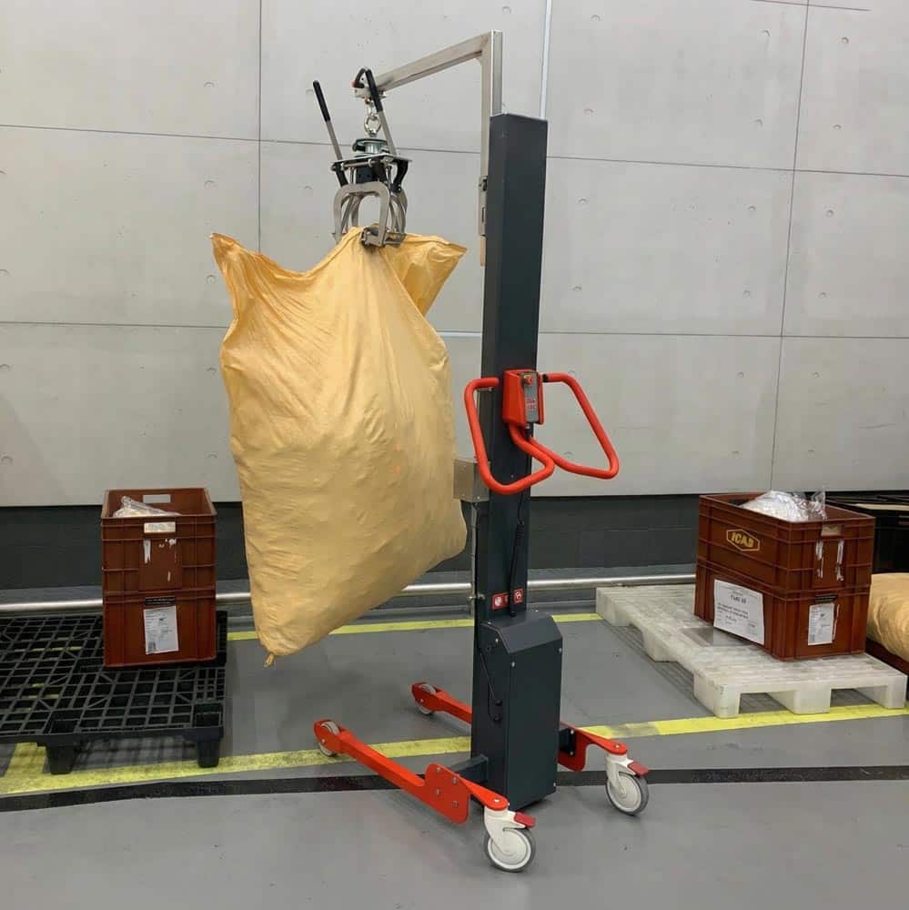 With electric lift and a manoeuvrable frame, this lightweight model supports frequent handling of filled sacks up to 125kg, helping teams position loads onto benches, into bins or onto processing equipment with better stability and less physical effort. A range of platform and crane attachment options allows the unit to be configured for supported lifting or suspended hoisting, depending on how sacks are moved within your workflow.